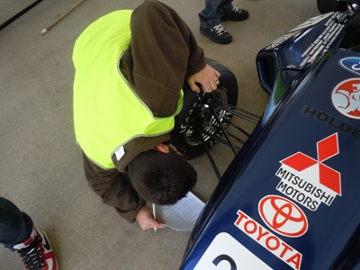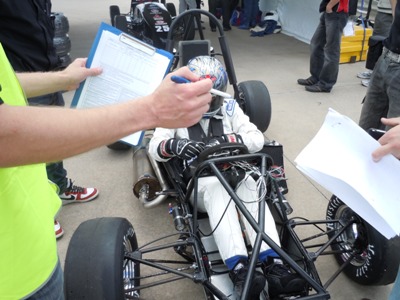 | Formula SAE とは? | 2010年12月10日 本日はテクニカルインスペクションと静的イベントが同時に行われるため、大会会場へ 朝一番で乗り込みます。 6:30朝食を取り、7:20宿を出発!ゲートオープンである7:30ちょうどに大会会場へ乗り 込みます。 9:00 Costイベントがあるため、静的イベントの会場へ向かいます。 Costイベント終了後、車検へ向かいます。エンジンと電装の問題が まだ解決していませんが、車検項目に必要な箇所は問題ありませ ん。 静的イベントの写真は後ほどアップいたします。 車検の様子。細かいところまで入念にチェックします。 オフィシャル3名で抜けもれなくチェックします。 脱出試験の様子。車両から5秒以内に脱出できなくてはなりませ ん。当チームの車両はコンパクトなため、脱出は難しいと思われま すが、結果は3秒。問題なく通過することが出来ました。 この車検では、ノーズの先端Rが小さすぎる。ブレーキは配管の取 り回し方など、15項目指摘を受けました 早速ピッドへ戻り対策を打ちます。 電装に問題があり顔を濁す中山。 車検の問題を解決しましたが、すでに車検が終了。明日朝一番で 車検に向かいます。 |